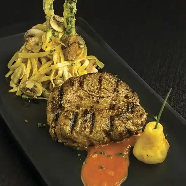 Lomo fino de la casa macerado al grill, acompañado con salsa de aceitunas y pasta al dente.
