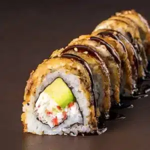 Elaborado con anguila crocante, cubierto con una fina capa de aguacate, acompañado con salsa de anguila.