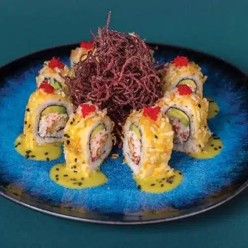 Crocante merito marinado, cangrejo y aguacate, cubierto con harusame, caviar, acompañado de una salsa de pimiento y maracuyá.